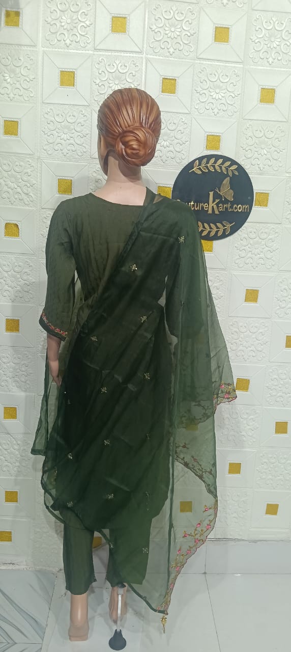 Product Description Bring elegance and luxury to your wardrobe with this beautifully designed Silk 3-Piece Suit, perfect for festive and special occasions. Crafted from premium-quality silk fabric, this suit includes a stylish kurti, a comfortable matching bottom, and a coordinated dupatta for a complete traditional look. The rich texture and natural sheen of silk enhance the overall appeal, making it an ideal outfit for weddings, parties, and celebrations. Key Features Fabric: Premium Silk Set Includes: Kurti, Bottom & Dupatta Feel: Soft, Smooth & Luxurious Design: Elegant detailing / embroidery (as applicable) Fit: Comfortable and flattering silhouette Occasion: Wedding Wear, Party Wear, Festive Functions Why You’ll Love It This silk suit combines timeless style with all-day comfort, giving you a refined look for every special moment.