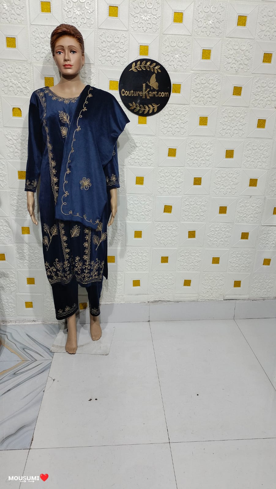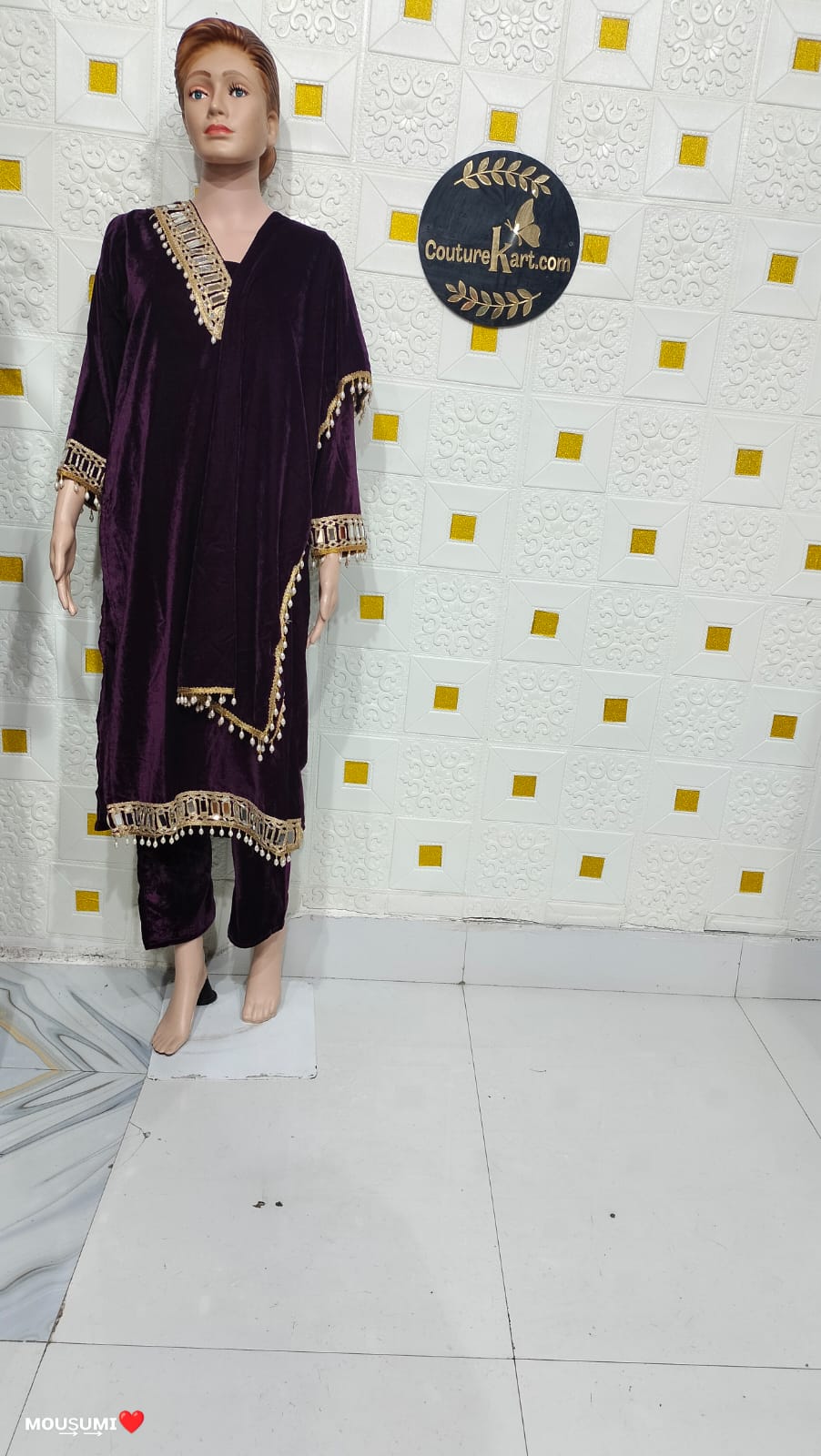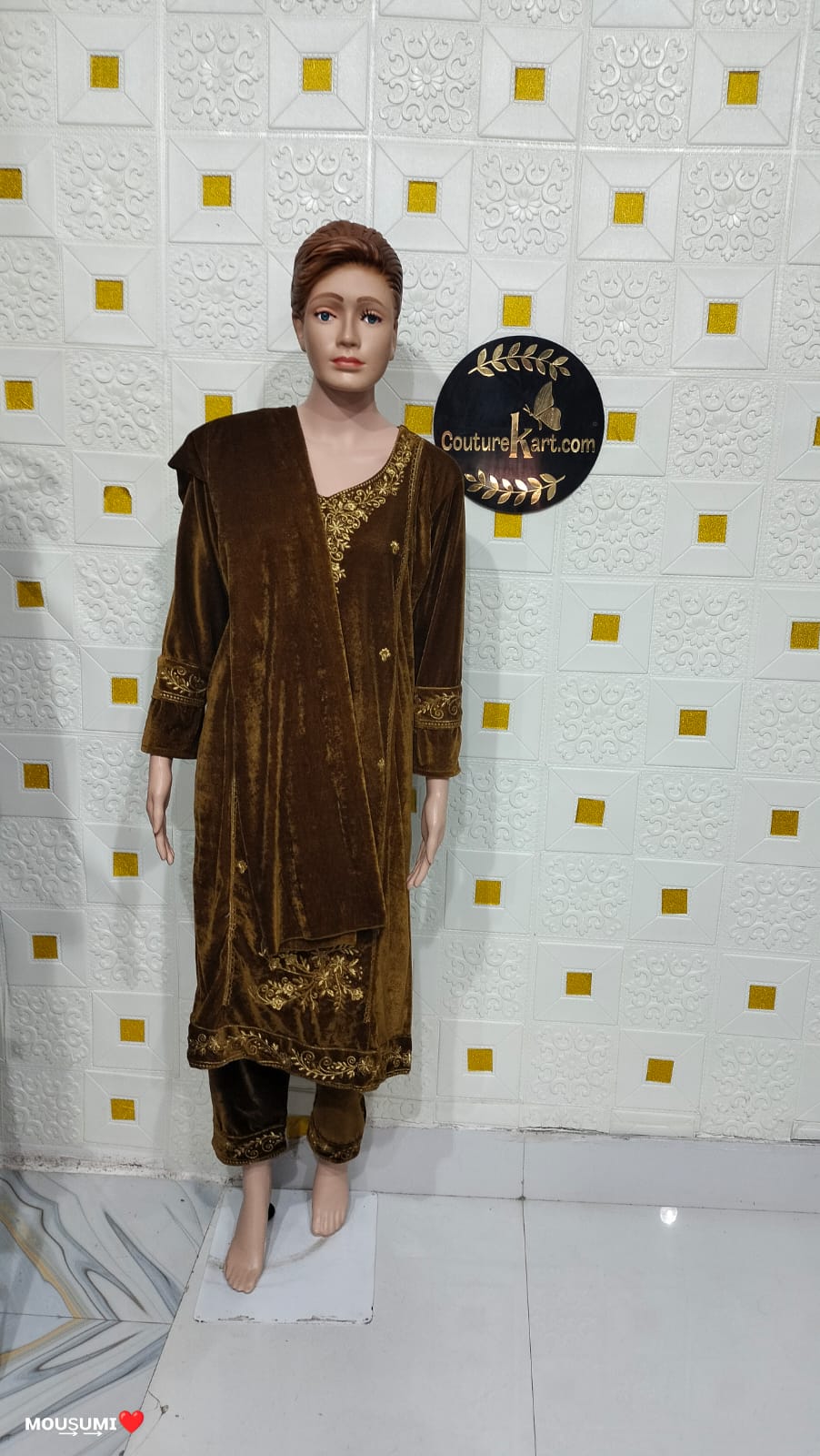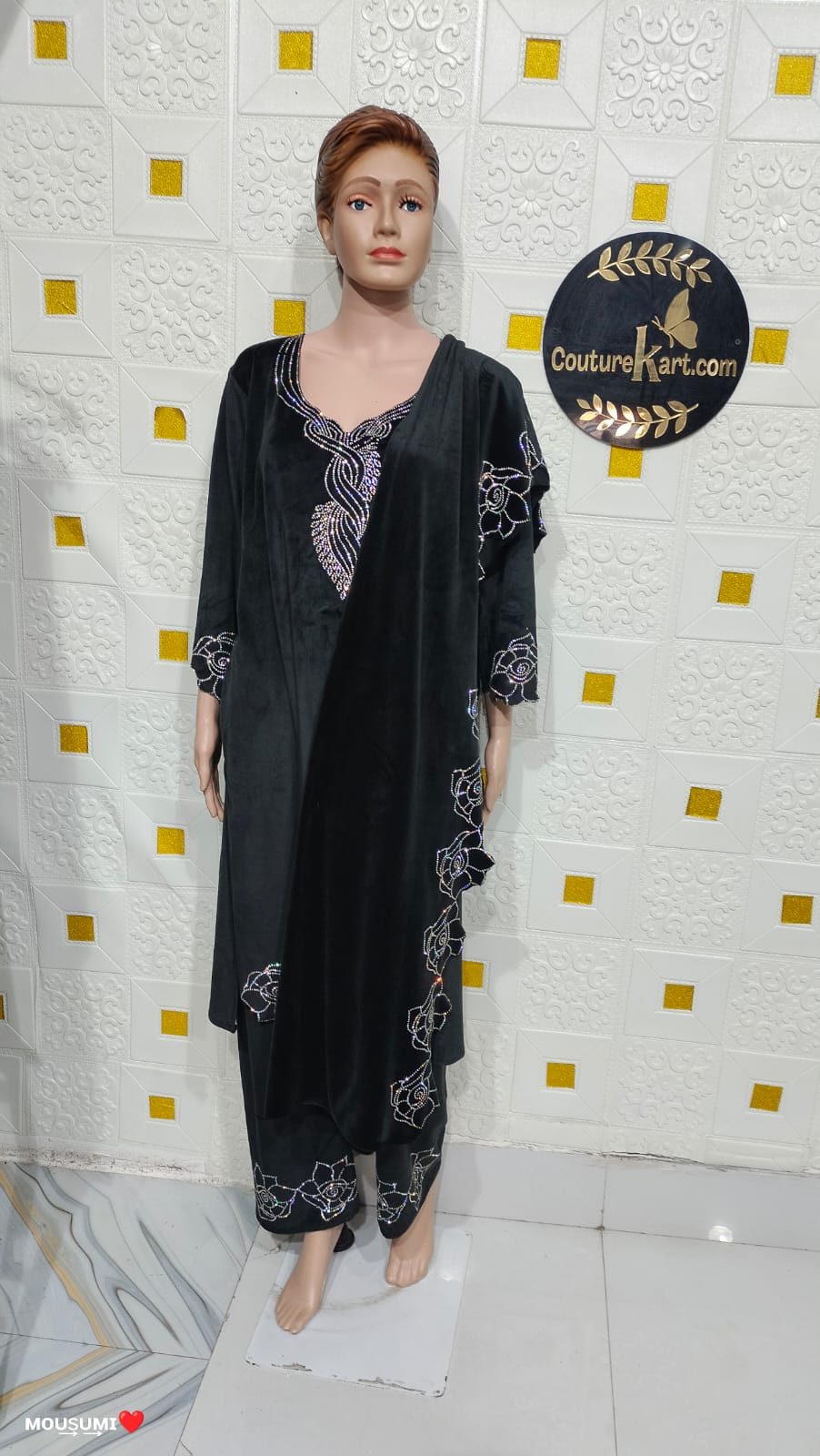 Soft Velvet Pearl Work 3 Pcs Suit For Women
