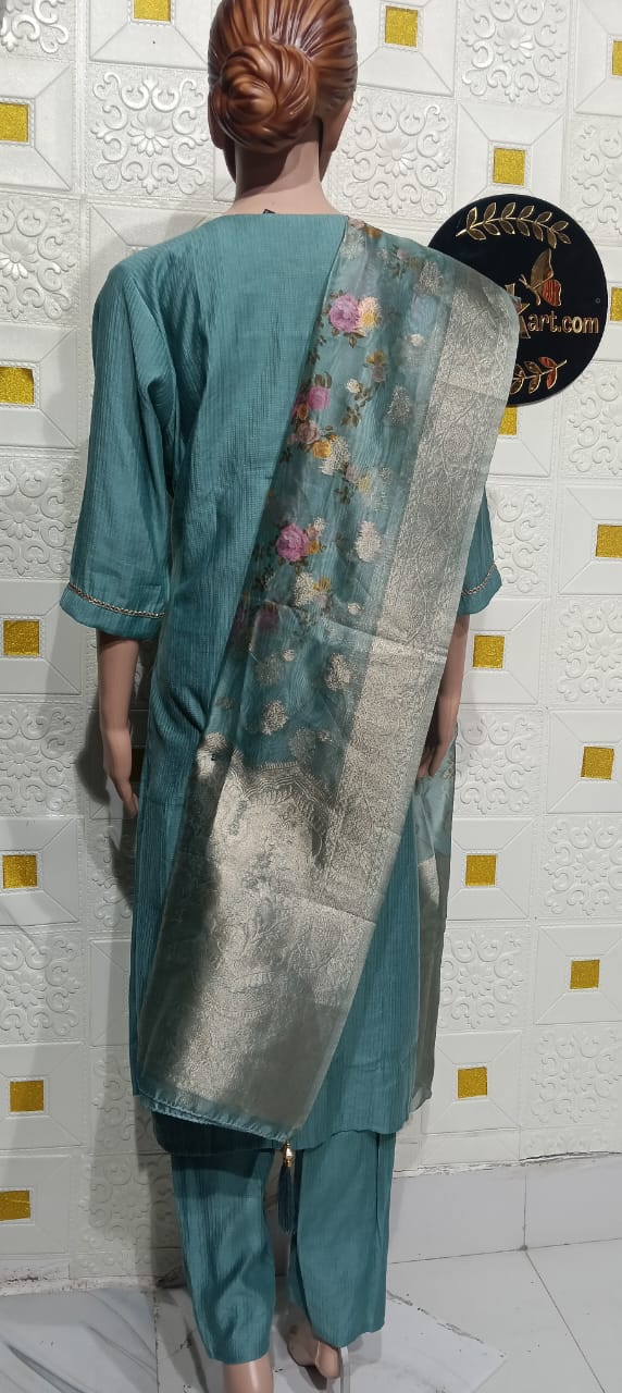 Product Description Add effortless elegance to your wardrobe with this beautiful 3-Piece Suit in soft georgette fabric. Designed for comfort and style, this outfit includes a finely tailored kurti, a matching bottom, and a complementing dupatta. The lightweight and breathable georgette drapes gracefully, offering a flattering fit with a soft, flowy look. Perfect for parties, festive gatherings, and special occasions, this suit blends sophistication with everyday comfort. Key Features Fabric: Soft Georgette Set: 3 Pieces (Kurti + Bottom + Dupatta) Texture: Lightweight, Smooth & Flowing Design: Elegant Detailing / Minimal Embroidery / Printed (as applicable) Fit: Comfortable & Flattering Occasion: Party Wear, Festive Wear, Casual Gatherings Why You’ll Love It Soft on the skin and stylish in appearance, this georgette suit is perfect for those who love a classy look with all-day comfort.