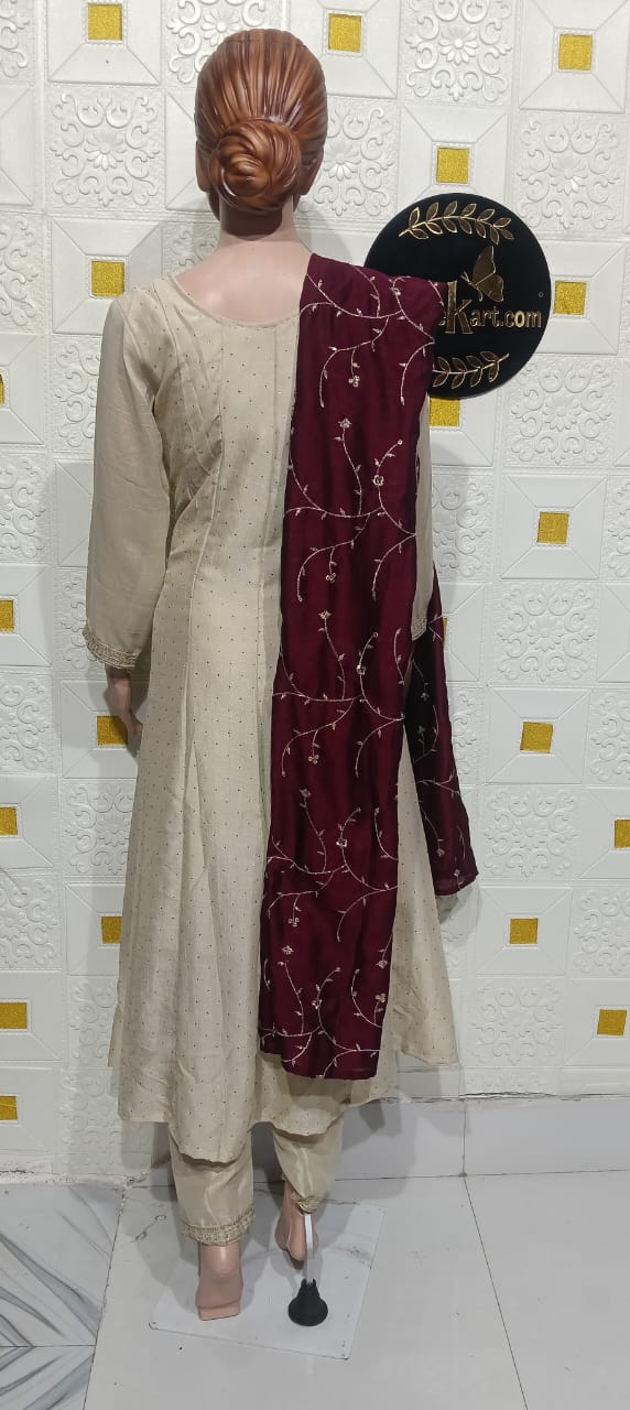 Product Description Make a graceful statement with this elegant 3-Piece Silk Frock Suit, designed for a perfect blend of tradition and style. Crafted from premium silk fabric, the frock-style kurti offers a flowy silhouette that adds charm and sophistication to your look. Paired with a matching bottom and a beautifully coordinated dupatta, this outfit is ideal for festive occasions, parties, and wedding functions. The rich texture and soft shine of silk enhance the overall appeal, giving you a luxurious and refined finish. Key Features Fabric: Premium Silk Set Includes: Frock-Style Kurti, Bottom & Dupatta Style: Flared / Anarkali-Inspired Frock Design Feel: Smooth, Soft & Comfortable Design: Elegant detailing / embroidery (if applicable) Occasion: Party Wear, Festive Wear, Wedding Events Why You’ll Love It The frock pattern combined with rich silk fabric creates a timeless and flattering look that never goes out of style.