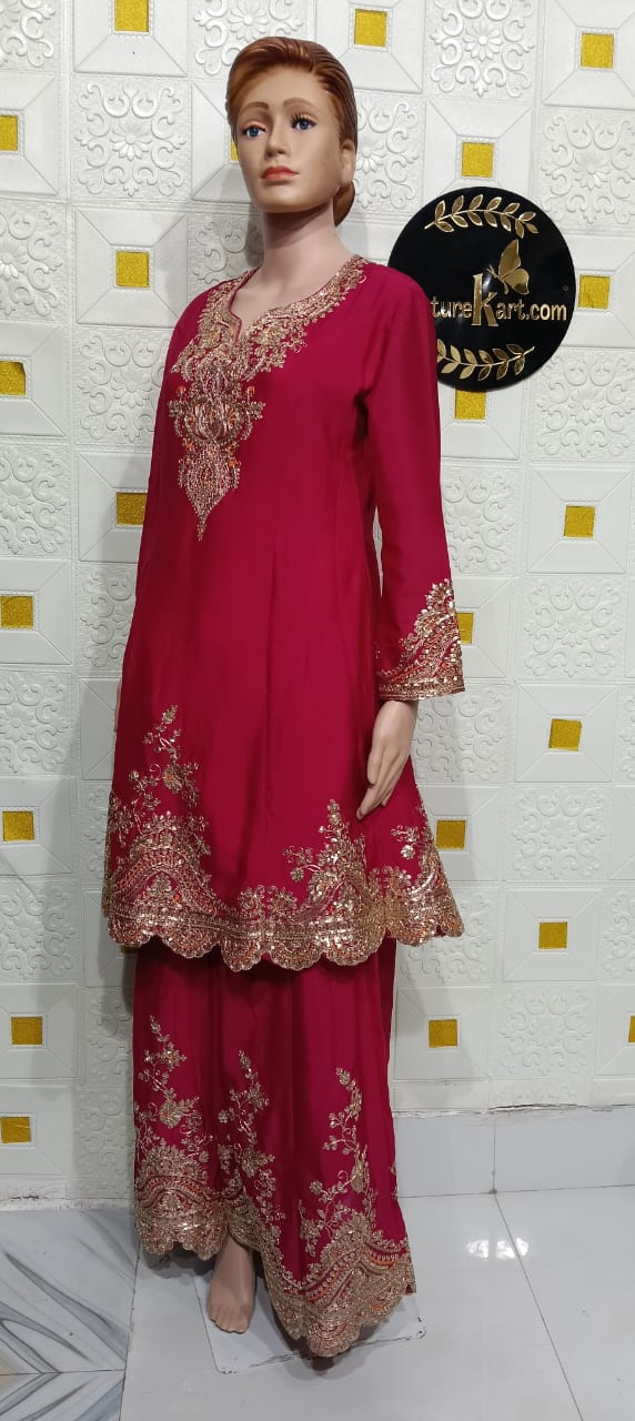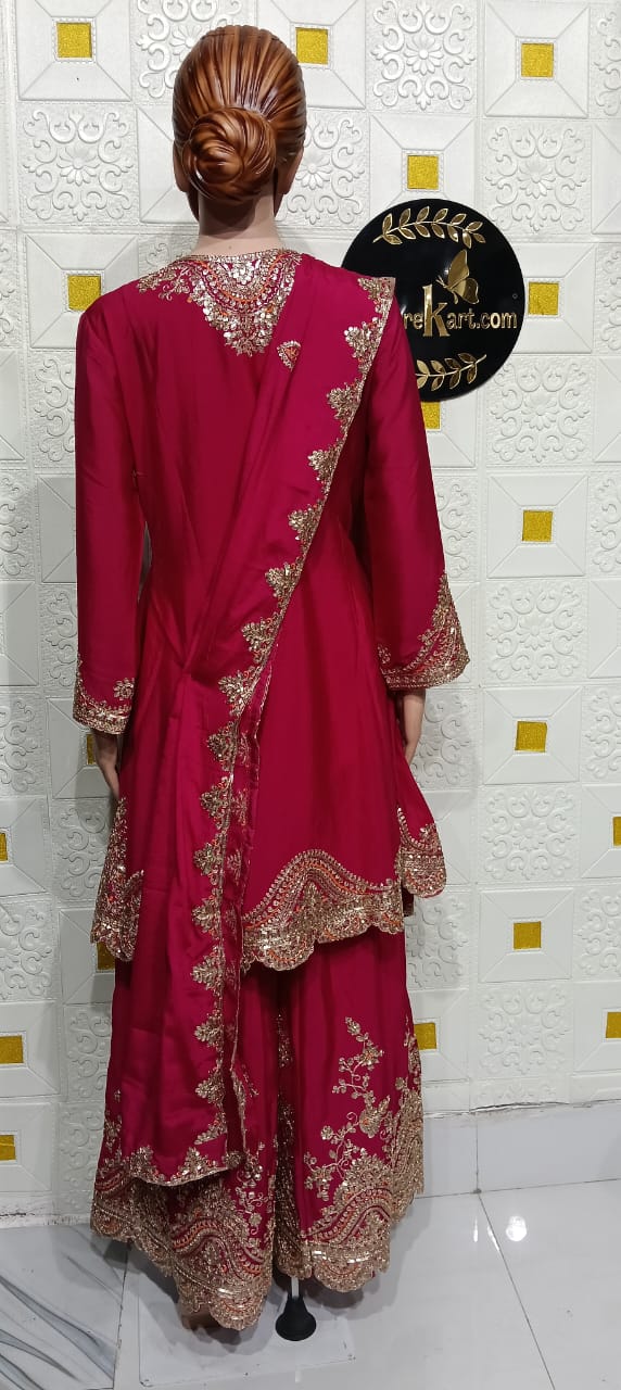 Anarkali Sarara Suit – Product Description Make a striking style statement with this elegant Anarkali Sarara Suit, a perfect blend of traditional design and contemporary charm. The Anarkali kurta features a flowy, flared silhouette that enhances every movement, while intricate embroidery/handwork adds richness and refinement to the overall look. The outfit is paired with beautifully flared sarara pants that offer comfort, grace, and a modern twist to classic ethnic wear. A coordinated dupatta with delicate detailing completes the ensemble, making it ideal for festive events, weddings, and special celebrations. Key Features: Flowy, flared Anarkali kurta with elegant detailing Intricate embroidery or embellishments for a luxurious finish Comfortable, stylish sarara pants with wide flare Matching dupatta with coordinated accents Perfect for festive occasions, weddings, and party wear Style Tip: Complement this outfit with statement earrings and embellished juttis for a sophisticated, festive-ready look.