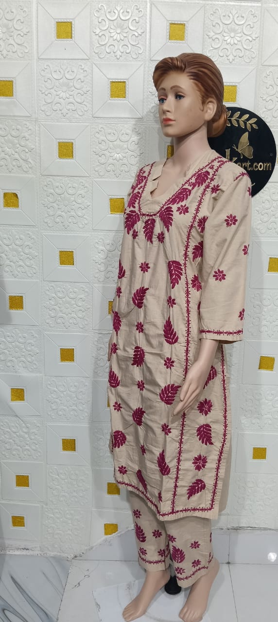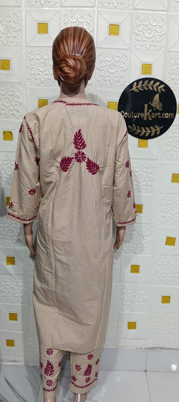 Product Description Experience timeless elegance with this beautiful Chikankari Co-ord Set in pure Khadi cotton, crafted for comfort with traditional charm. The set features delicate chikankari embroidery on a soft, breathable khadi cotton base, paired with a matching bottom for a graceful and stylish look. The natural texture of khadi combined with fine hand-style embroidery makes this outfit perfect for everyday wear, office use, and casual gatherings. Key Features Fabric: Khadi Cotton Set Includes: Chikankari Top & Bottom Work: Authentic Chikankari Embroidery Feel: Soft, Breathable & Eco-friendly Fit: Comfortable and flattering Occasion: Daily Wear, Office Wear, Casual Outings Why You’ll Love It This chikankari khadi set blends classic craftsmanship with modern comfort, making it a perfect choice for an elegant everyday look.