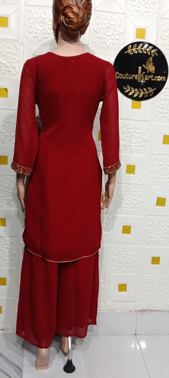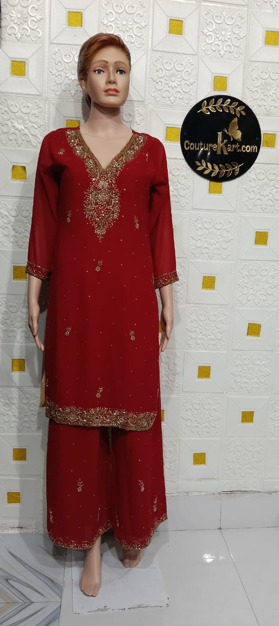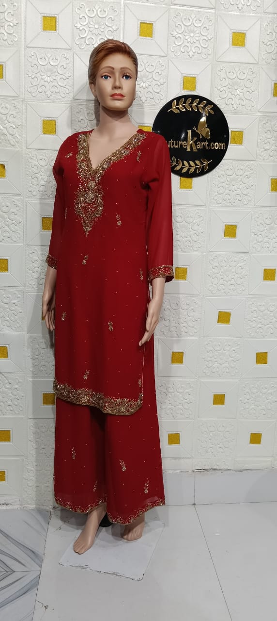 Georgette Sarara Suit – Product Description Elevate your festive and occasion wear with this stunning Georgette Sarara Suit, designed to blend traditional charm with modern elegance. Crafted from premium-quality georgette fabric, the outfit offers a graceful flow, lightweight comfort, and a flattering silhouette for all body types. The kurta features intricate embroidery that adds a touch of sophistication, while the wide-flare sarara bottoms bring an effortless, feminine drape. Paired with a matching dupatta adorned with delicate detailing, this ensemble delivers a complete, refined look suitable for weddings, parties, and festive celebrations. Key Features: Premium, lightweight georgette fabric Elegant embroidery / embellishment on kurta Flared sarara pants for enhanced movement and comfort Coordinated dupatta with subtle detailing Perfect for festive, party, and special-occasion wear Style Tip: Pair with statement earrings and embroidered juttis for a beautifully coordinated look.