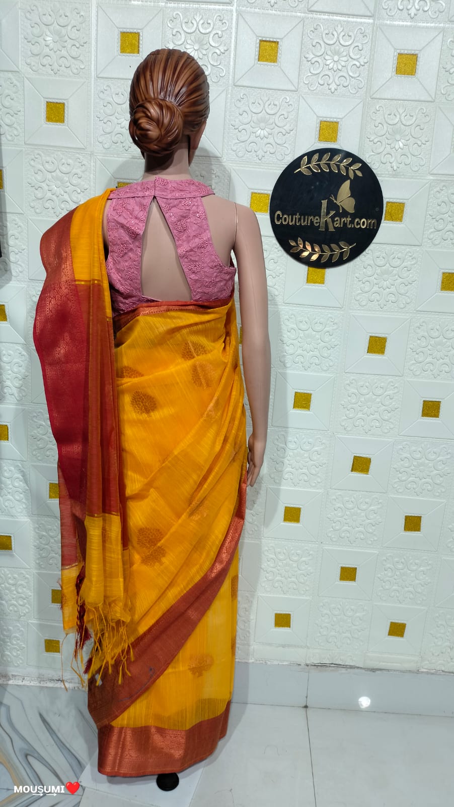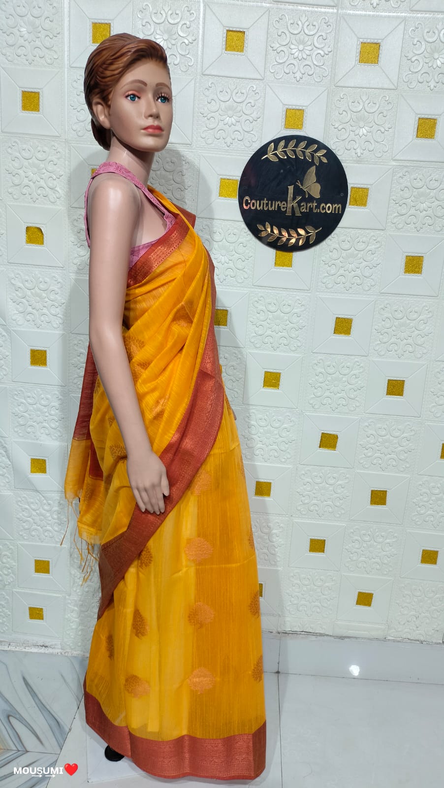 Handloom Body Work Copper Zori Saree – Product Description Experience the perfect blend of tradition and elegance with our Handloom Body Work Copper Zori Saree. Expertly woven by skilled artisans, this saree features intricate body work that enhances its rich texture and adds a touch of sophistication to every drape. The shimmering copper zori border and pallu bring a luxurious glow, making it a standout choice for festive and special occasions. Crafted from premium handloom fabric, the saree offers a soft, breathable feel and a graceful fall, ensuring comfort without compromising on style. The combination of detailed body weaving and elegant copper zori work creates a timeless piece suited for women who appreciate authentic craftsmanship. Features: Authentic handloom weave with detailed body work Premium copper zori border for a rich, festive finish Lightweight, breathable, and comfortable for long wear Elegant texture and smooth drape Ideal for weddings, festivals, traditional gatherings, and formal events Elevate your ethnic wardrobe with the Handloom Body Work Copper Zori Saree — a true celebration of heritage, craftsmanship, and refined beauty.