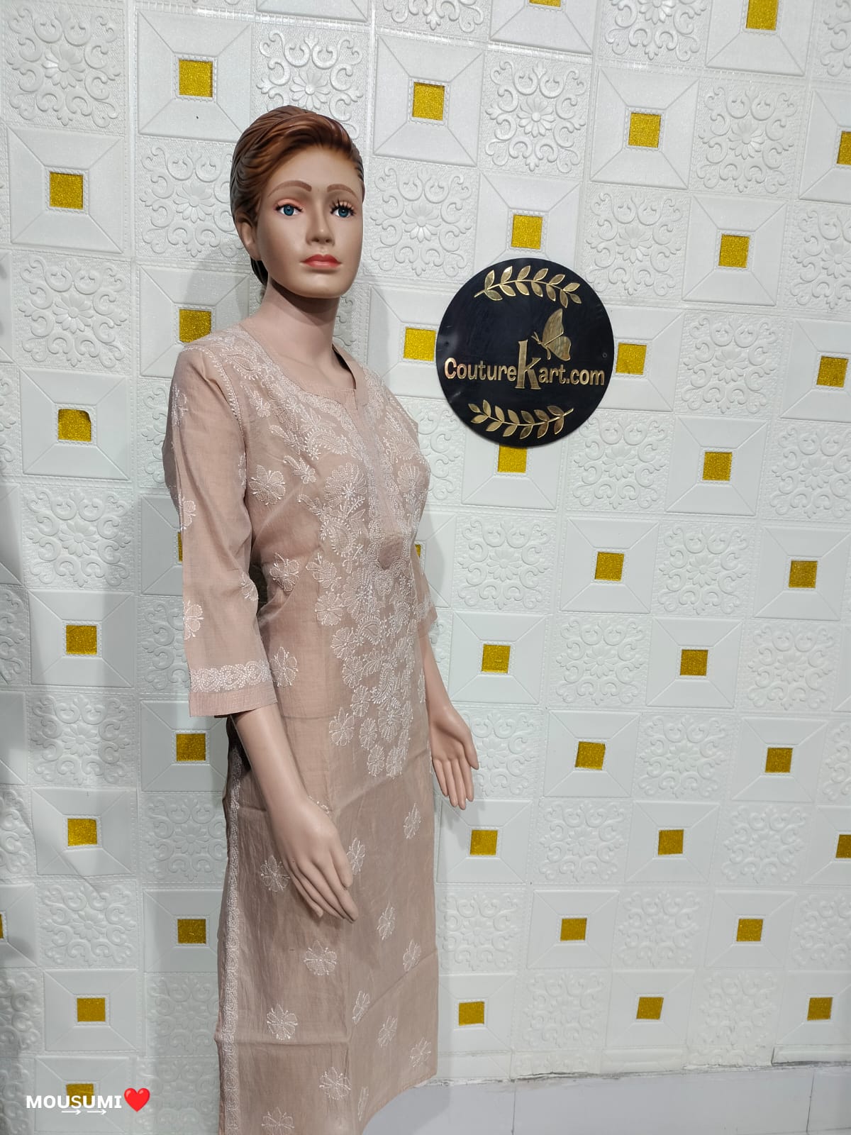 Lucknow Chikankari Single Kurti (Cotton) Experience the elegance of traditional craftsmanship with this beautiful Lucknow Chikankari Cotton Kurti. Made from premium breathable cotton fabric, this kurti features intricate hand-embroidered Chikankari work inspired by the rich heritage of Lucknow. Its lightweight feel and graceful design make it perfect for everyday wear as well as small festive gatherings. Designed for comfort and style, this kurti effortlessly blends ethnic charm with modern simplicity. Product Details: Fabric: 100% Pure Cotton Work: Authentic Lucknowi Chikankari Hand Embroidery Style: Straight Kurti Sleeves: As per design Neckline: As per design Length: Knee-length / Calf-length (as applicable) Occasion: Casual Wear, Office Wear, Festive, Daily Wear Fit: Regular Fit Package Includes: 1 Kurti Only Care Instructions: Gentle hand wash separately in cold water. Do not bleach. Dry in shade. Iron on low heat.