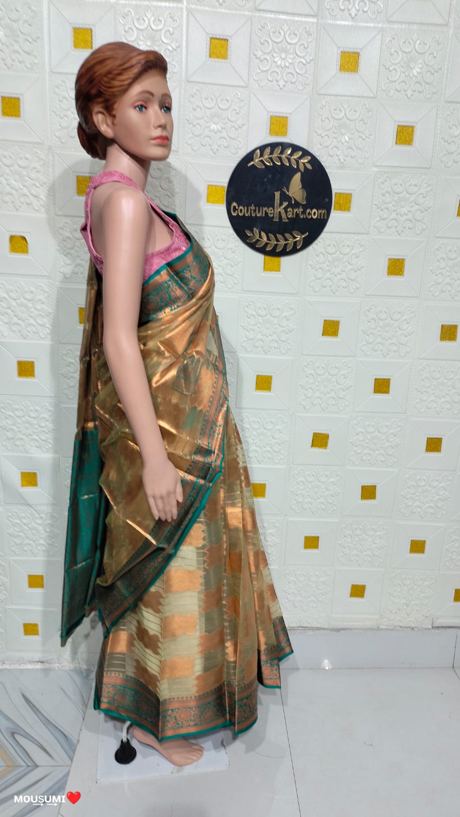 Organza Banarasi Saree – Product Description Step into sheer elegance with our Organza Banarasi Saree, an exquisite fusion of lightweight organza fabric and the timeless richness of Banarasi weaving. This saree features delicate zari motifs crafted using traditional Banarasi techniques, creating a luxurious blend of softness, shine, and heritage artistry. The translucent texture of organza paired with intricate brocade work gives the saree a regal yet graceful appearance. Perfect for weddings, festive celebrations, receptions, and grand occasions, this saree offers a sophisticated drape that feels airy, comfortable, and effortlessly stylish. The rich borders and beautifully woven pallu enhance its royal charm, making it a must-have piece for every elegant wardrobe. Features: Premium organza fabric with lightweight, flowy texture Authentic Banarasi zari weaving with intricate motifs Elegant borders and richly woven pallu Soft, comfortable drape suitable for long hours Perfect for weddings, parties, festive events, and special occasions Add a touch of grandeur and modern grace to your collection with this stunning Organza Banarasi Saree—where tradition meets contemporary luxury.
