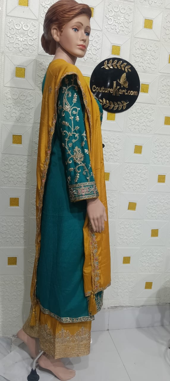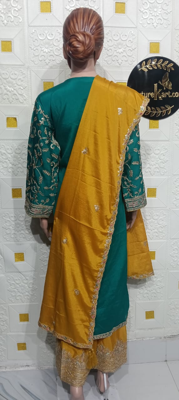 A Rajasthani suit is a vibrant and traditional ethnic outfit that reflects the rich cultural heritage of Rajasthan. Known for its bright colors, intricate handwork, and distinctive patterns, this suit typically features Bandhej (tie-dye) or Leheriya prints that symbolize festivity and elegance. The kurta often comes adorned with gota patti work, mirror embellishments, or block prints, paired with a comfortable salwar, churidar, or flared skirt-style bottom. The look is completed with a beautifully dyed dupatta, often featuring zari borders or delicate tassels. Perfect for festive occasions, weddings, and cultural celebrations, a Rajasthani suit blends traditional artistry with timeless charm.