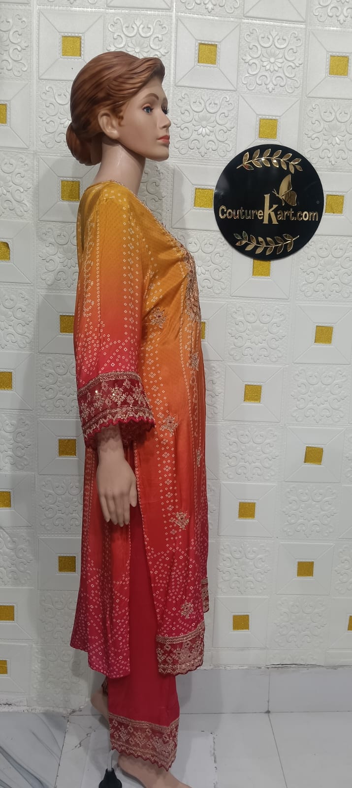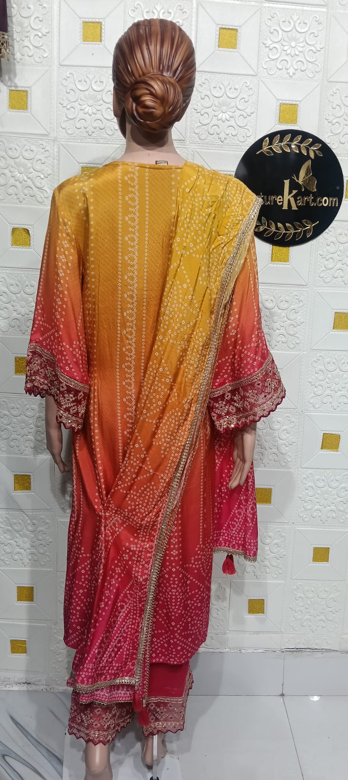 Product Description Make a graceful style statement with this luxurious Sharara Party Wear 3-Piece Silk Suit, designed to bring elegance and charm to your festive wardrobe. Crafted from premium-quality silk fabric, the set features a beautifully tailored kurti, a flared sharara, and a matching dupatta for a complete, regal look. The rich texture and subtle sheen of silk enhance the overall appeal, making it perfect for weddings, parties, and special celebrations. Key Features Fabric: Premium Silk Set Includes: Kurti, Sharara & Dupatta Style: Party Wear / Festive Wear Texture: Soft, Smooth & Lustrous Design: Elegant embroidery / embellishments (as applicable) Fit: Comfortable and flattering silhouette Occasion: Wedding Functions, Party Wear, Festive Events Why You’ll Love It This silk sharara suit offers a perfect blend of traditional charm and modern elegance—ideal for standing out at any celebration.