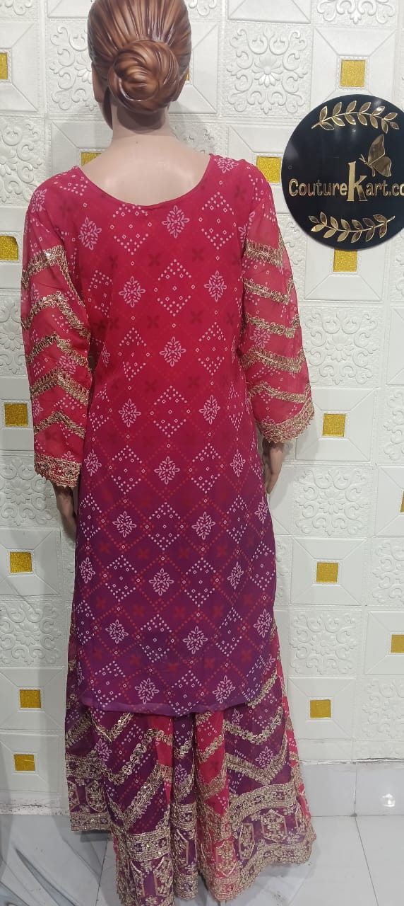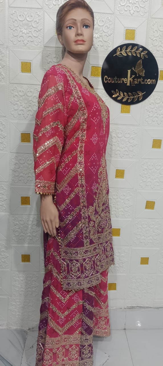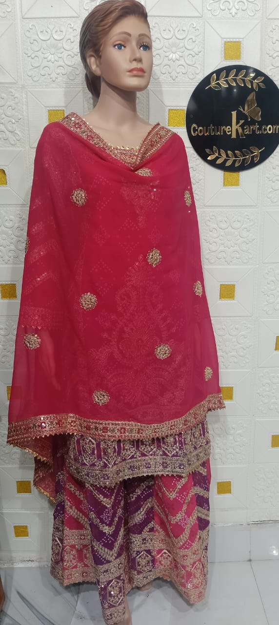 Product Description Step into timeless elegance with this beautifully designed Pakistani Sharara Suit, crafted to reflect rich tradition with a touch of modern style. The outfit features a stylish kurti paired with a flared sharara and a matching dupatta, creating a graceful and regal silhouette. Made from premium-quality fabric and detailed with delicate embroidery and embellishments, this suit is perfect for weddings, festive events, and special occasions. Key Features Style: Traditional Pakistani Sharara Suit Set Includes: Kurti, Sharara & Dupatta Fabric: Premium-quality fabric (as per design) Work: Elegant embroidery / detailing Fit: Comfortable and flattering Occasion: Wedding Wear, Festive Functions, Party Wear Why You’ll Love It With its flowing sharara and classic Pakistani design, this outfit offers a perfect blend of luxury, elegance, and cultural charm.