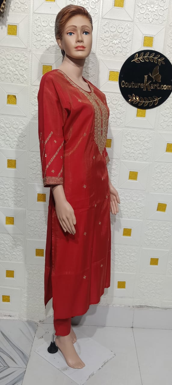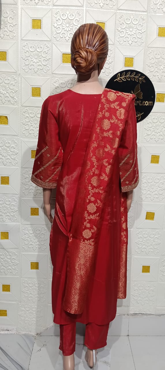 Product Description Experience timeless elegance with this luxurious 3-Piece Silk Suit, designed for a graceful and sophisticated look. Made from premium-quality silk, the suit features a beautifully crafted kurti, a comfortable matching bottom, and a coordinated dupatta that completes the ensemble. The rich texture and natural sheen of silk enhance its festive appeal, making it an ideal choice for weddings, parties, and special occasions. Key Features Fabric: Premium Silk Set Includes: Kurti, Bottom & Dupatta Texture: Smooth, Soft & Rich Finish Design: Elegant detailing / embroidery (if applicable) Fit: Comfortable and flattering silhouette Occasion: Party Wear, Festive Wear, Wedding Functions Why You’ll Love It This silk suit brings together luxury, comfort, and style—perfect for making a refined statement at any celebration.