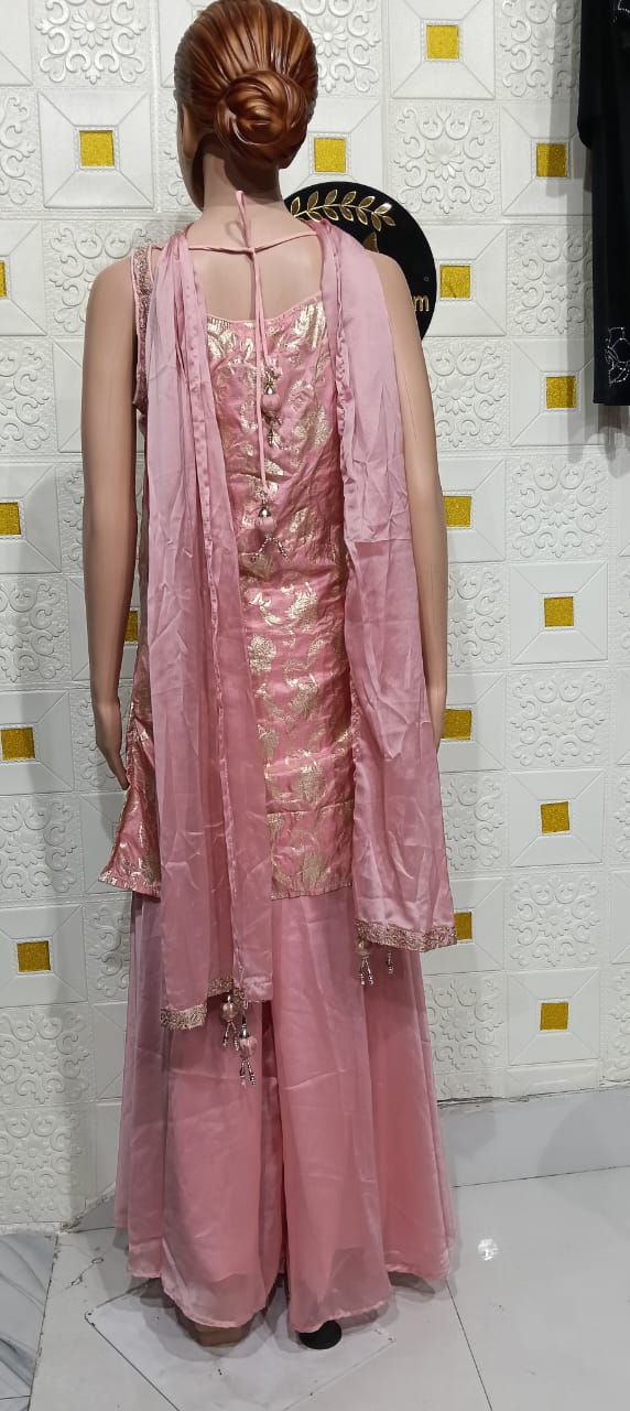 Silk Sarara Suit – Product Description Step into timeless elegance with this exquisite Silk Sarara Suit, crafted to offer a luxurious blend of tradition and contemporary style. Made from premium silk fabric, the ensemble features a natural sheen, soft drape, and rich texture that instantly enhances your festive or occasion-wear look. The kurta is beautifully designed with intricate embroidery/handwork that adds sophistication and charm. Complementing it are the flared sarara pants, tailored to provide effortless movement and a graceful silhouette. A matching dupatta with fine detailing completes the ensemble, making it perfect for weddings, celebrations, and special events. Key Features: Crafted from premium-quality silk with a natural, elegant shine Intricate embroidery or embellishments on the kurta Flared sarara pants create a stylish and comfortable fit Matching dupatta with coordinated detailing Ideal for weddings, festive occasions, and party wear Style Tip: Pair this outfit with pearl or kundan jewelry and embellished heels for a regal, polished look.