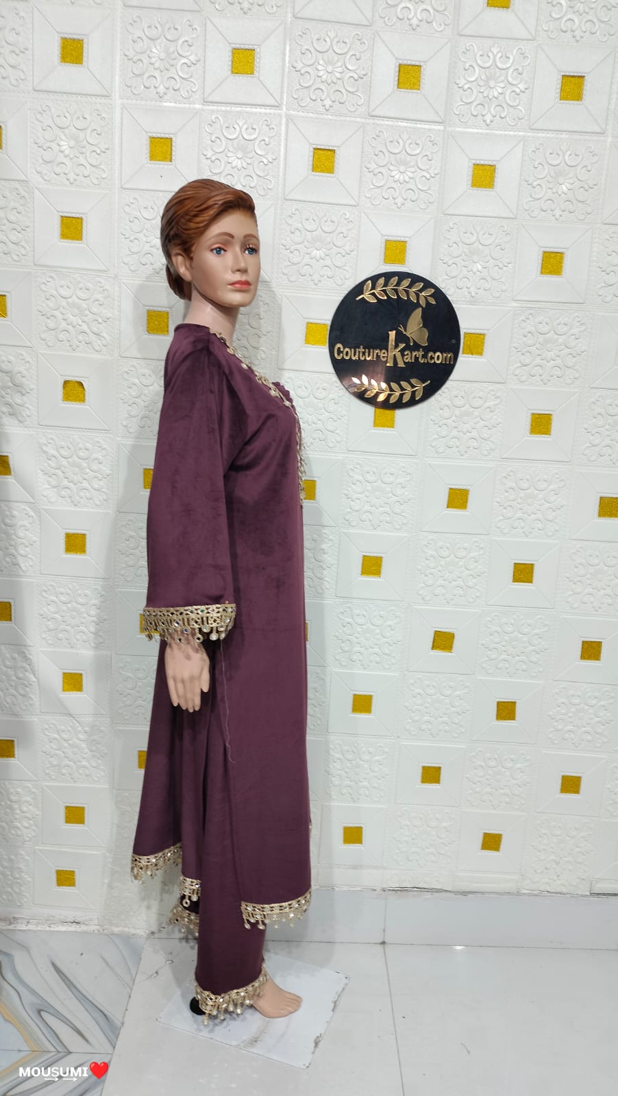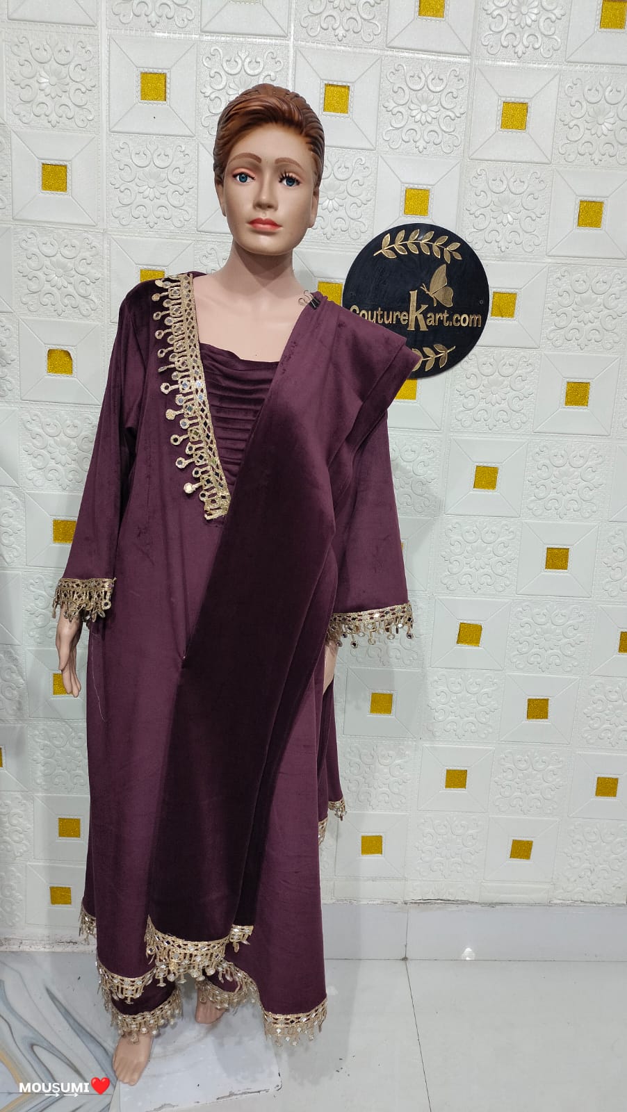 Velvet Mirror Work 3 Pcs Suit for Women Elevate your ethnic style with our Velvet Mirror Work 3 Pcs Suit, designed to bring luxury and traditional charm together. Crafted from premium velvet fabric, this suit features elegant mirror work that adds a sparkling festive touch and a rich, royal look. This beautiful three-piece set includes a velvet kurta, matching bottom, and a coordinated dupatta, making it a complete outfit for special occasions. The soft and warm velvet ensures maximum comfort while keeping you stylish throughout the season. Perfect for weddings, festive celebrations, parties, and evening events, this suit helps you stand out with grace and confidence. Features: Premium-quality velvet fabric Elegant mirror work detailing 3-piece set: Kurta, bottom & dupatta Soft, warm and luxurious feel Festive and party-wear design Comfortable and flattering fit Ideal for winter occasions Care Instructions: Dry clean recommended to protect mirror work and fabric quality. Do not bleach. Store carefully.